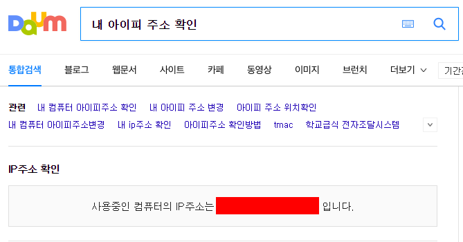포털 사이트(다음, 네이버)에 "내 아이피 주소 확인" 이라고 검색하면 바로 확인이 가능합니다.