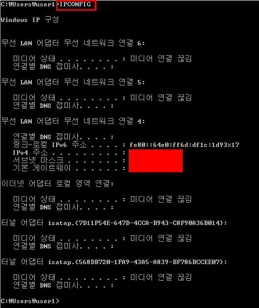 아래의 사진과 같이 "IPCONFIG"를 입력하신 후 엔터를 치시면 아이피 주소 확인이 가능합니다.