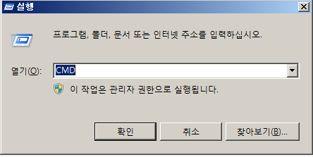 키보드에서 시작 + R을 같이 누르신 후 아래와 같이 "CMD"를 입력하신 후