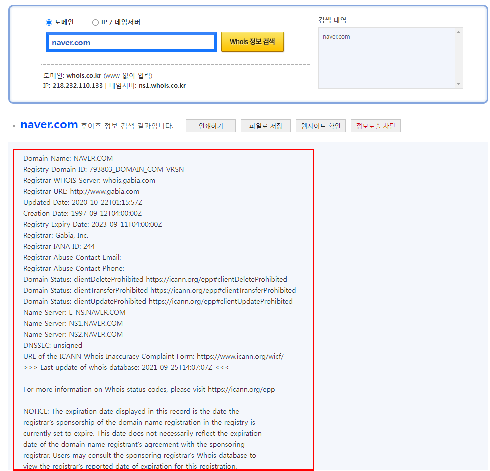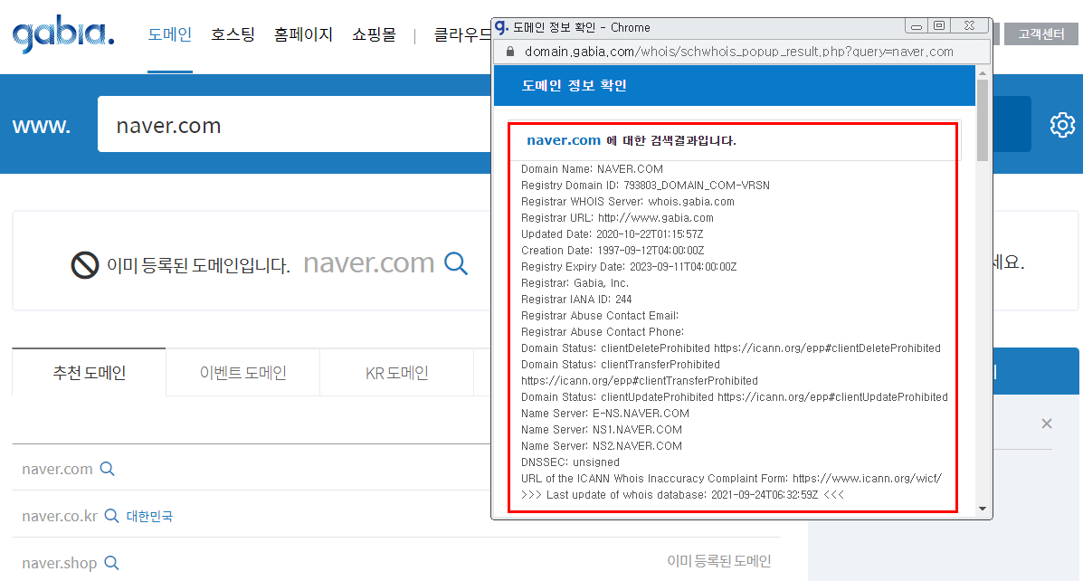 가비아(https://www.gabia.com), 후이즈(https://whois.co.kr)등의 사이트에서 검색하여 확인할수 있습니다.