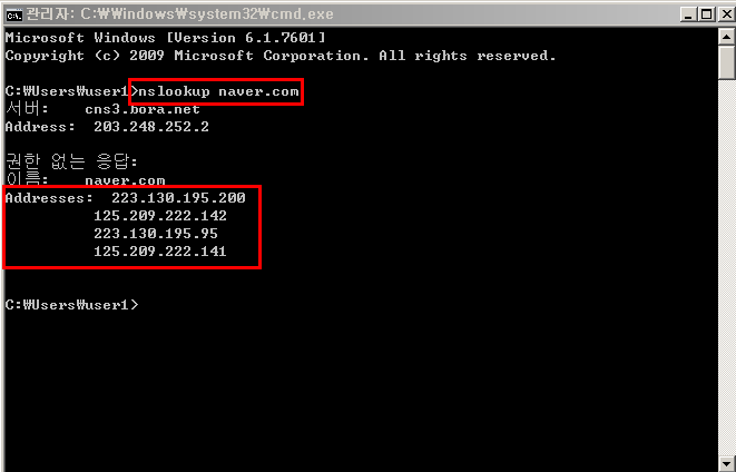 명령프롬프트창에 "nslookup 확인하고자하는도메인주소"를 입력하면 서버의 아이피 확인이 가능합니다.