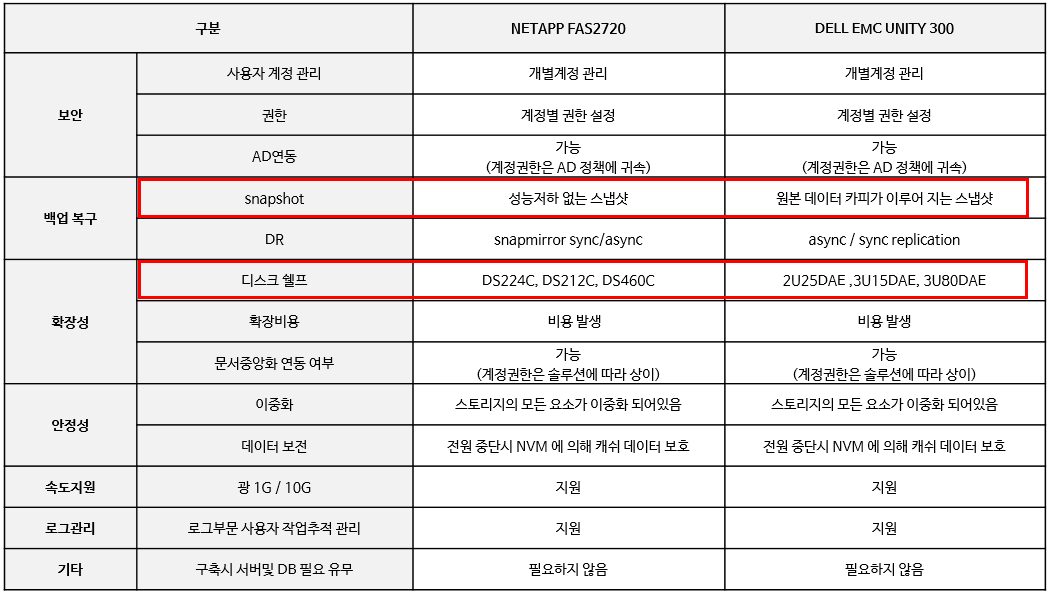 기능비교(NETAPP FAS2720 VS DELL EMC UNITY 300)