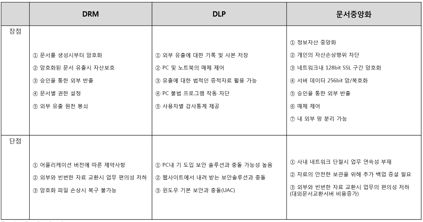일반적인 기업에서 사용하는 보안 솔루션 中 내부 정보 유출에 대한 보안 솔루션 3가지(DLP, DRM, 문서중앙화)에 대해 비교해보겠습니다.