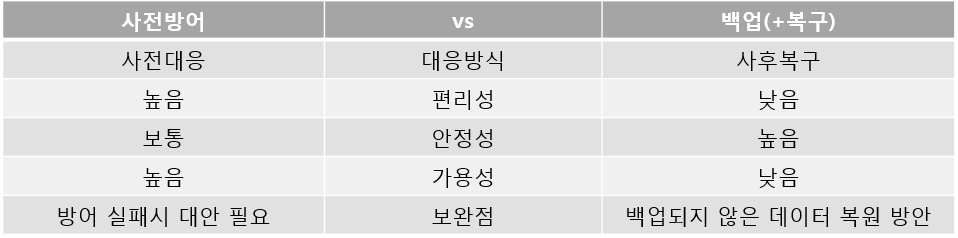 랜섬웨어 대응 기술은 크게 사전방어와 백업(+복원) 기술로 나누어져 있습니다.