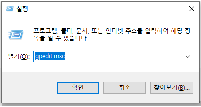 ① 키보드에서 윈도우 키 + R 을 동시에 눌러 실행창을 열고 gpedit.msc 입력 후 확인