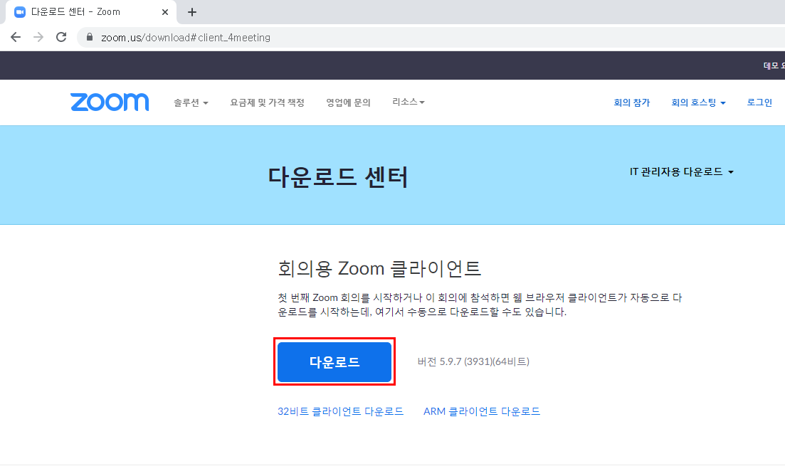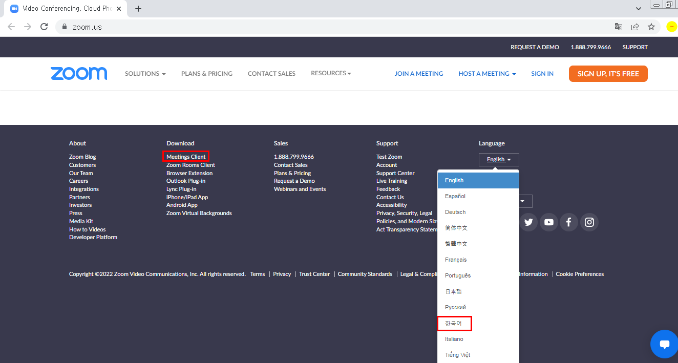 화면을 아래로 내려 언어를 "한국어"로 변경한 후 MEETING CLIENT(회의 클라이언트) 클릭