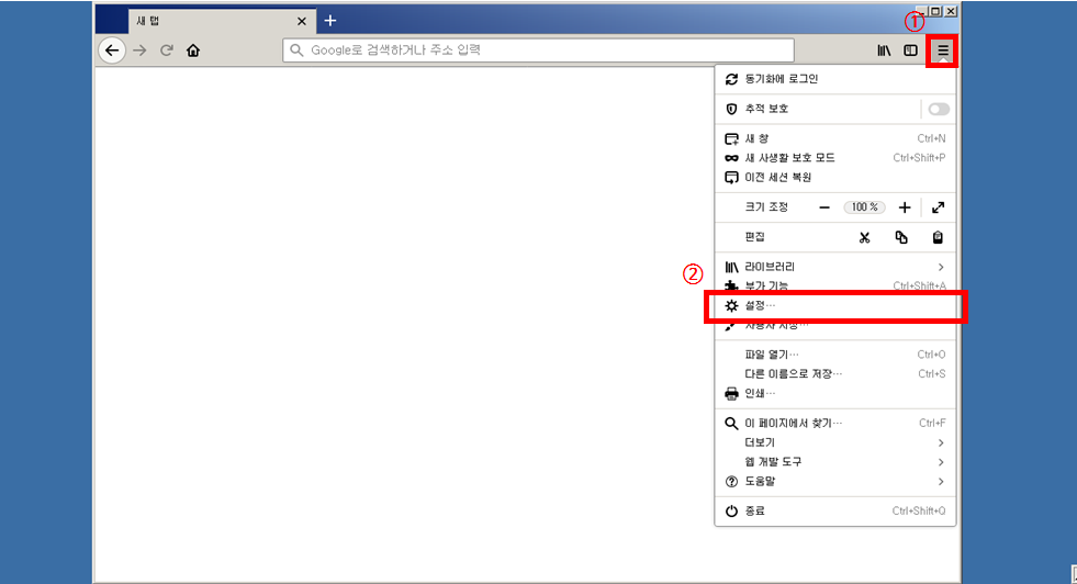 ① 파이어폭스 실행 후 화면 상단의 설정 아이콘 클릭, ② 설정 클릭