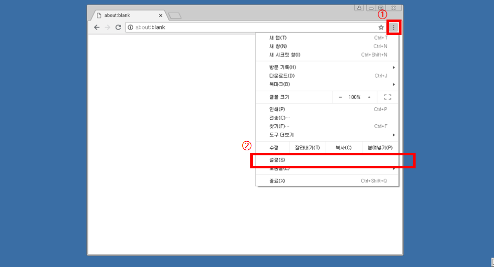 ① 크롬 실행 후 화면 상단의 설정 아이콘 클릭, ② 설정 클릭