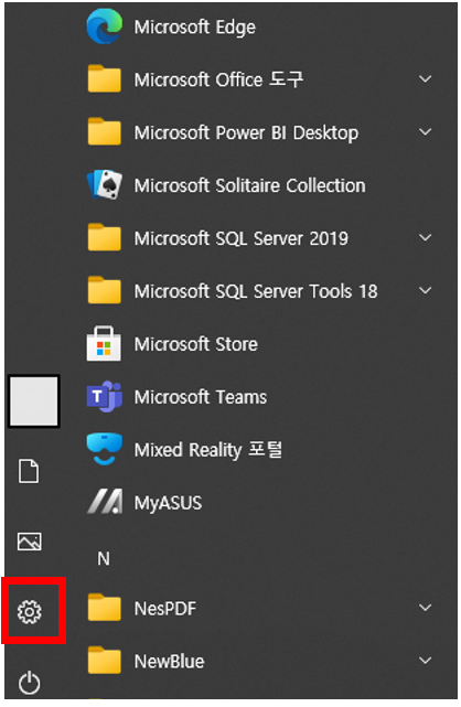 ① 시작 -> 설정 메뉴 클릭
