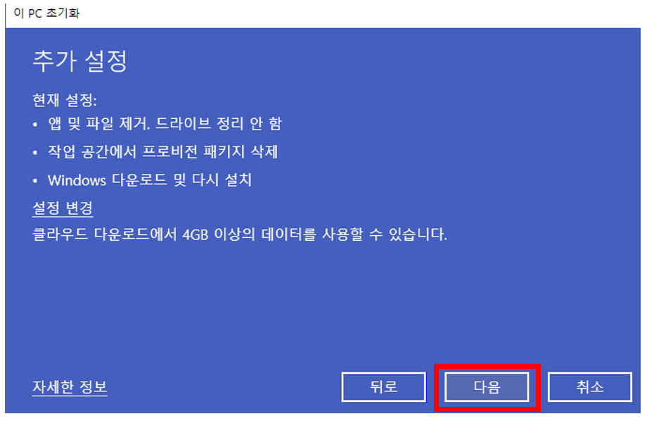 ⑥ 다음 클릭 → 윈도우 초기화 진행 → PC 재부팅