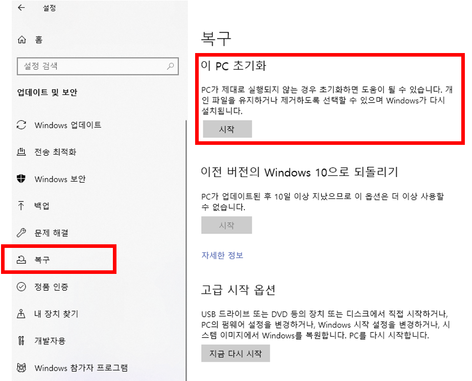 윈도우에서 지원하는 기본기능인 복구(초기화) 기능을 이용하여