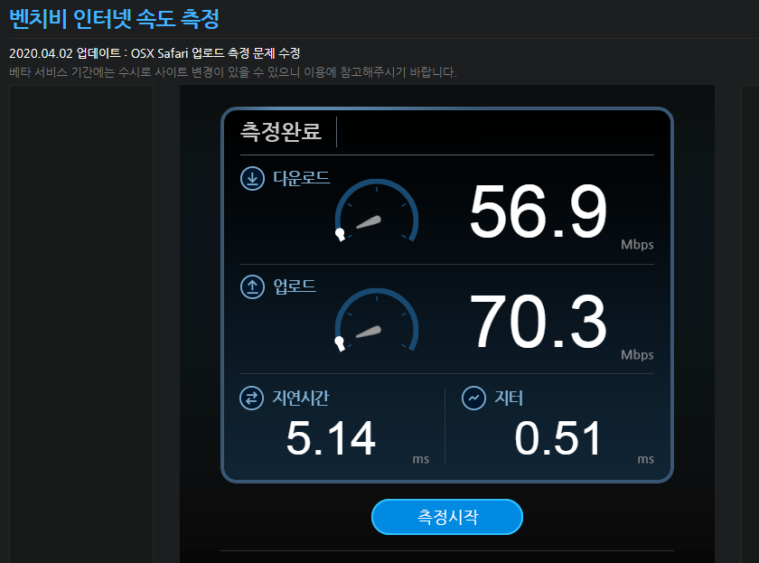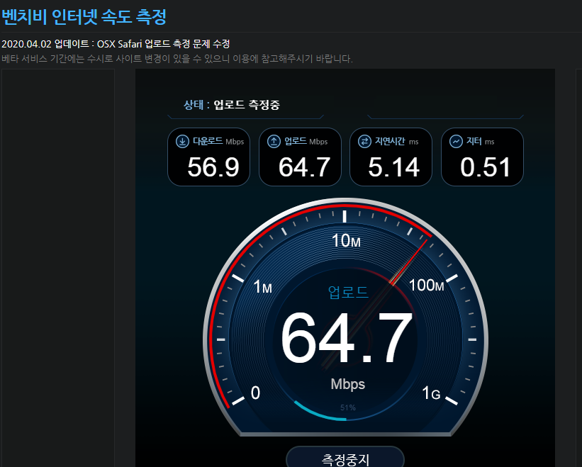 사이트에 접속해서 간단히 원클릭으로 현재 PC의 인터넷 속도(다운로드/업로드/지연시간/지터) 확인이 가능합니다.